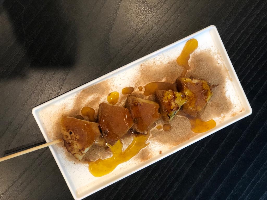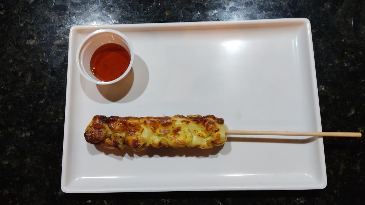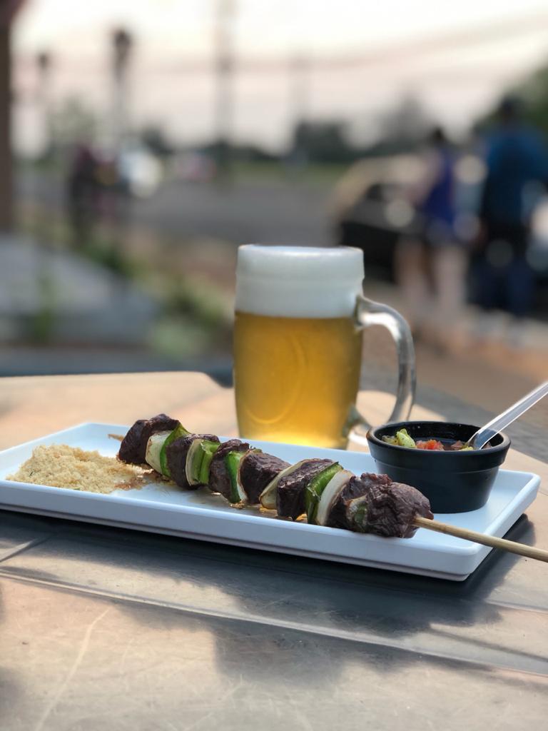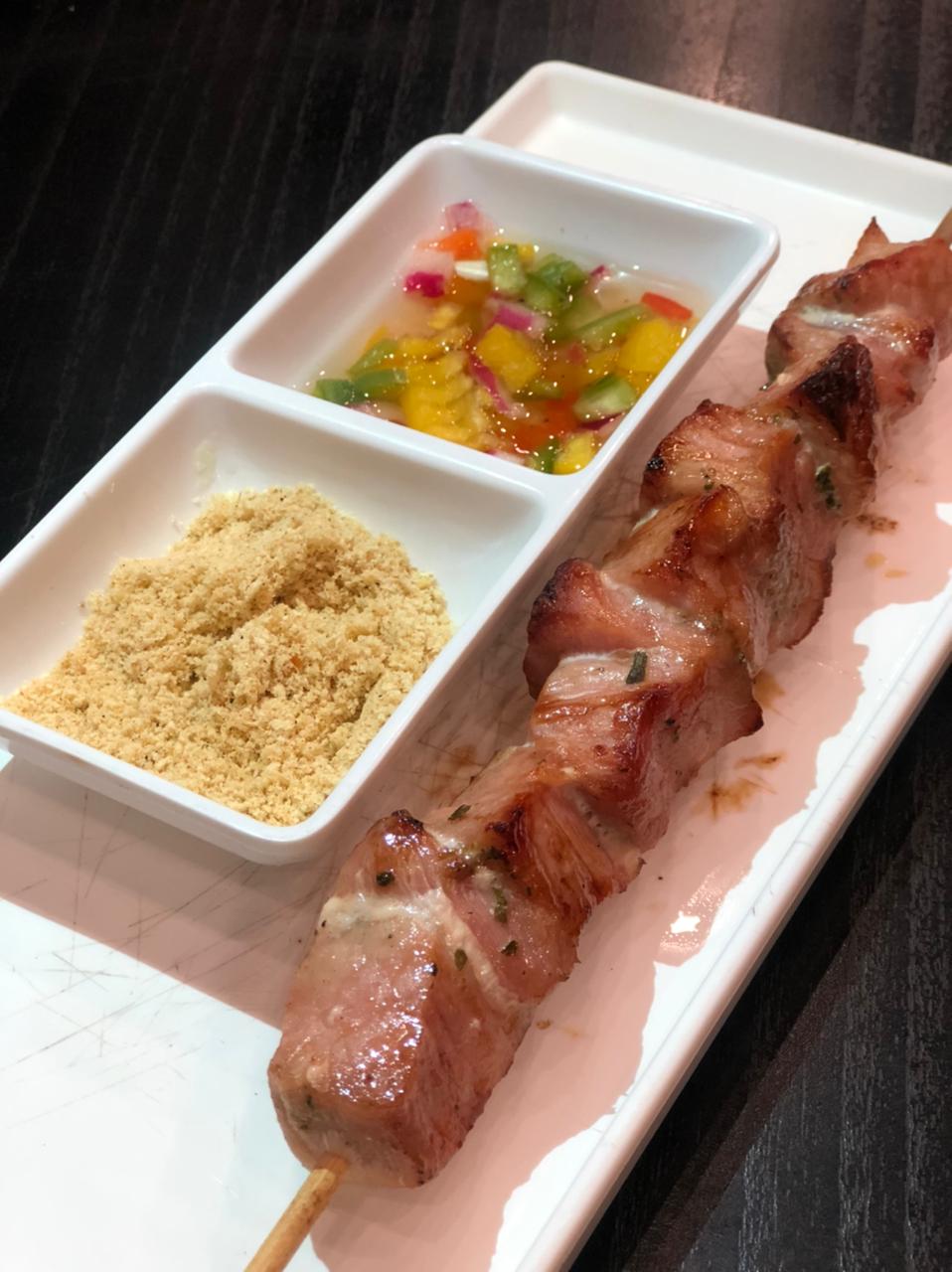 2 espetinhos tracionais acompanhados de arroz, mandioca cozida, farofa, vinagrete e salada.